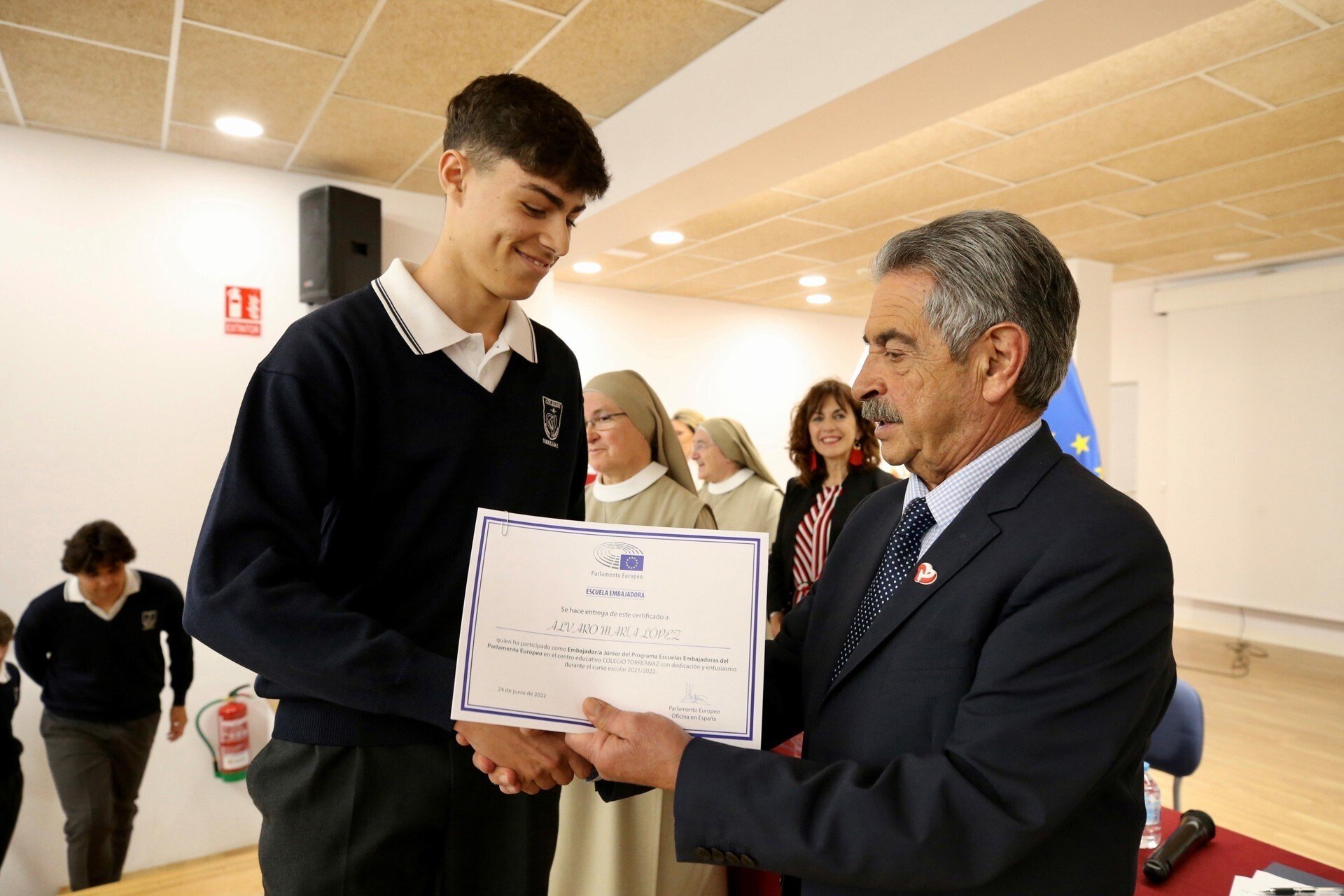 Invitado por los estudiantes del centro, Revilla ha otorgado una placa conmemorativa a la superiora de las Hijas de Santa María del Corazón de Jesús, la madre María Raquel, y un diploma a los 16 alumnos y 5 profesores que participaron en esta iniciativa que busca estimular y fomentar el conocimiento comunitario entre los jóvenes.