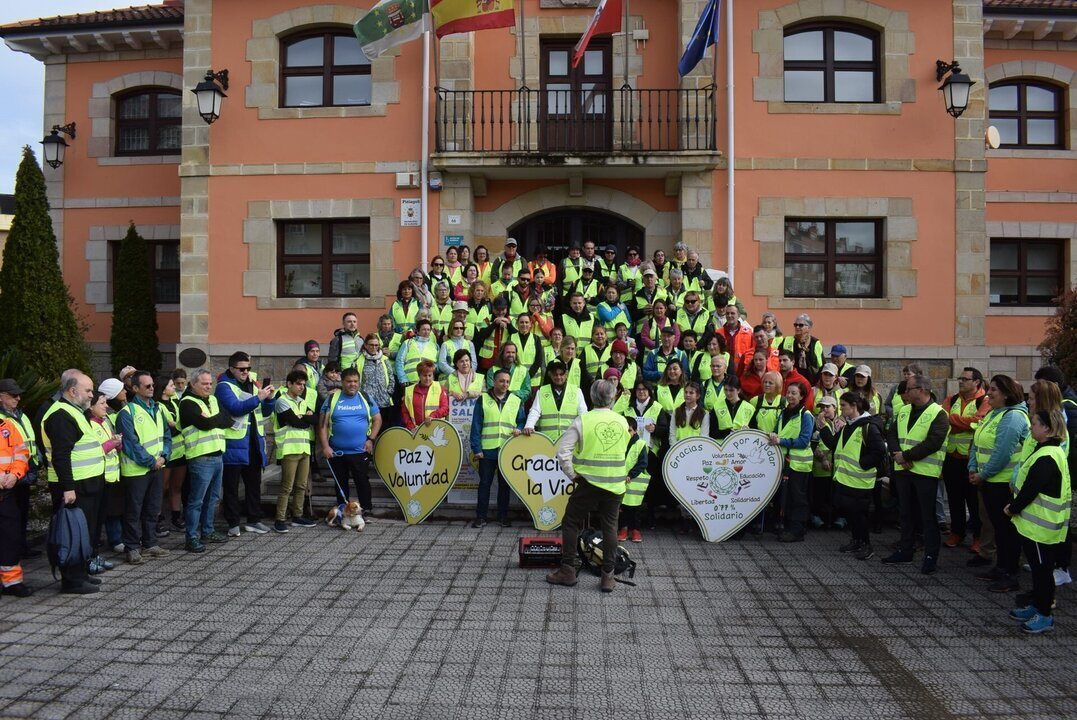 Así, vecinos de ambos municipios, junto con personas procedentes de diferentes puntos de la región e incluso de otras comunidades autónomas, han iniciado la marcha a las 10.00 horas en el Ayuntamiento de Piélagos en Renedo, y han recorrido 13 kilómetros hasta el pabellón municipal de La Concha de Villaescusa.