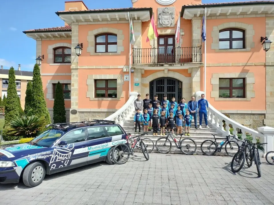 El alcalde de Piélagos, Carlos Caramés, junto con el concejal de Deportes y Juventud, Borja López, ha recibido en el Ayuntamiento a algunos integrantes de la Escuela Municipal de Ciclismo.