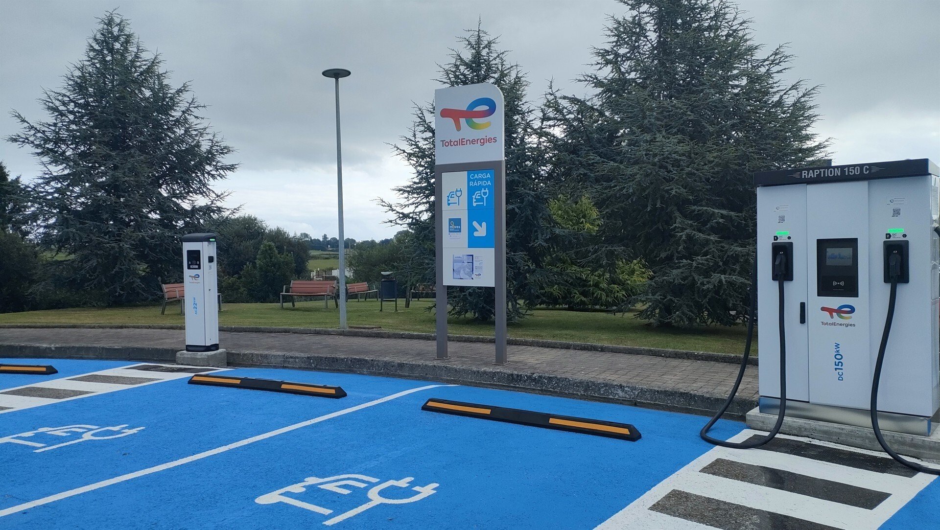 Se trata de un equipo de recarga ultrarrápida que con 150 kilovatios (kW) con doble manguera permite que dos coches recarguen su batería completa simultáneamente en aproximadamente 40 minutos; y a este equipo se une otro con 22 kW y doble enchufe.