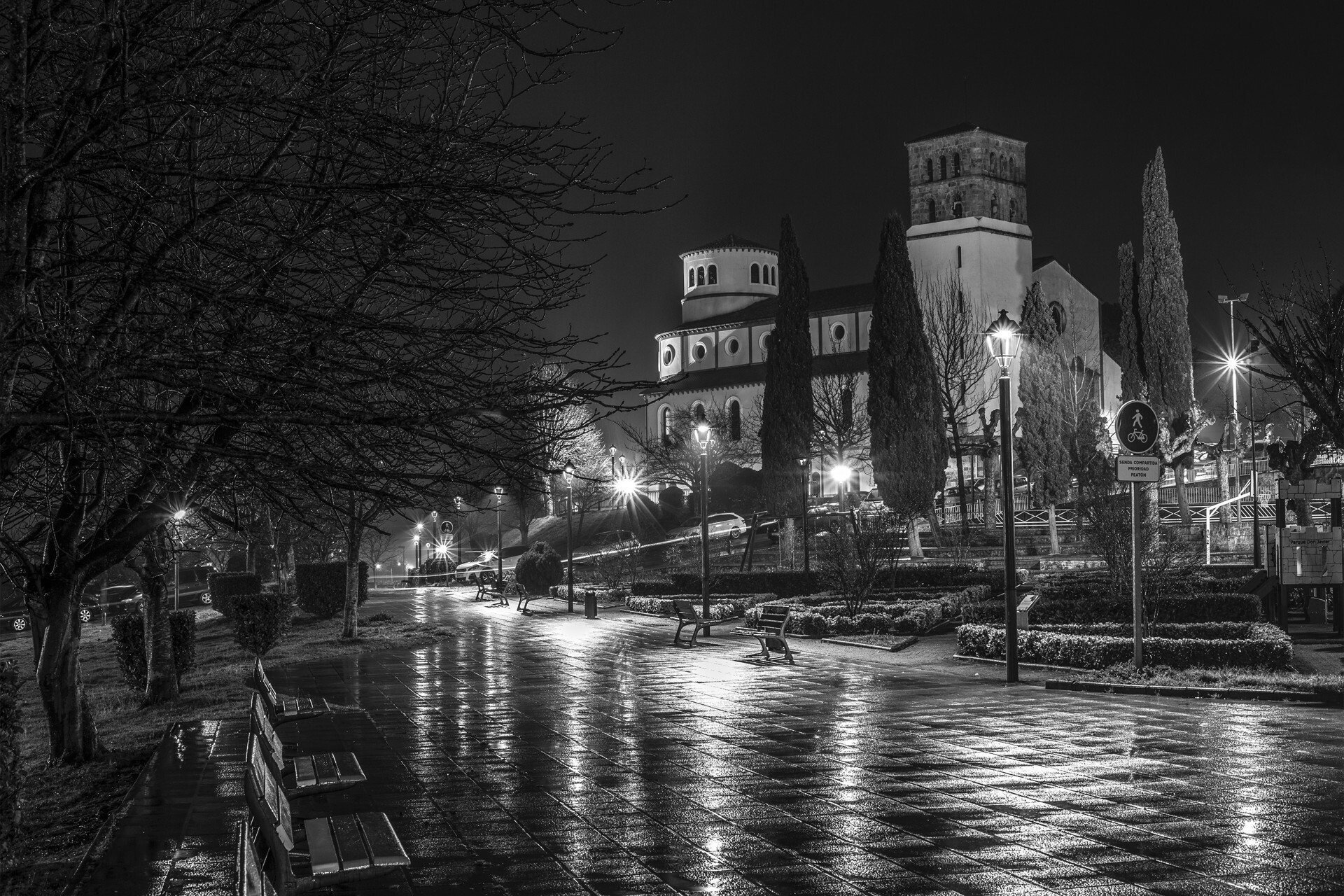 Su novedosa perspectiva del Parque de la Planchada en blanco y negro, en la que se observa al fondo la Iglesia de San José y que juega con las luces reflejadas sobre un suelo húmedo por la lluvia le ha valido el primer puesto en el concurso, explica el Consistorio en una nota de prensa.