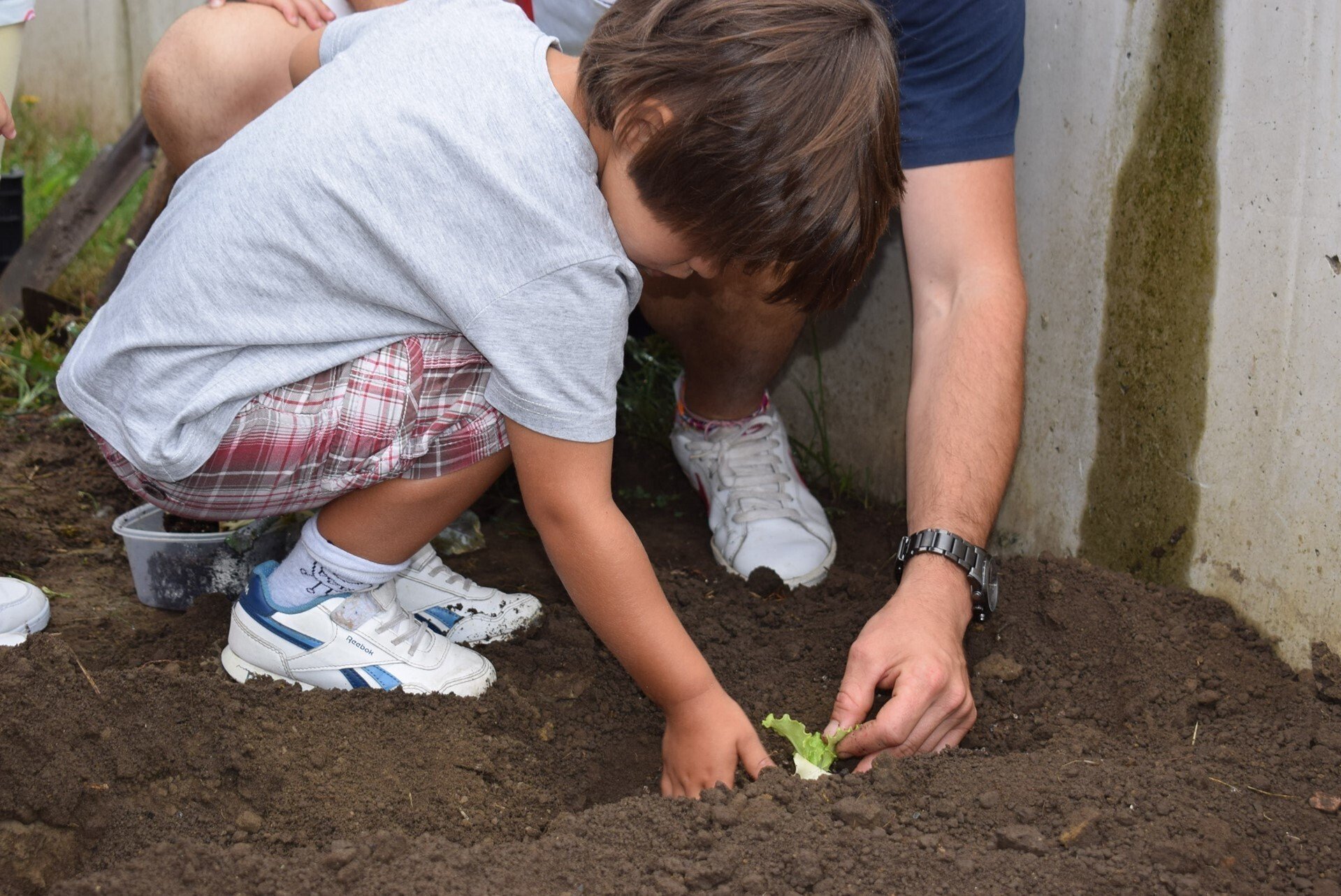 Los alumnos de la ludoteca hacen plastilina casera mezclando los ingredientes; convierten botellas de agua en bolos, y rollos de papel en juegos, o salen a la huerta para plantar lechugas y lombardas, mientras están pendientes de las mesas de cultivo donde hay fresas, tomates y pimientos.
