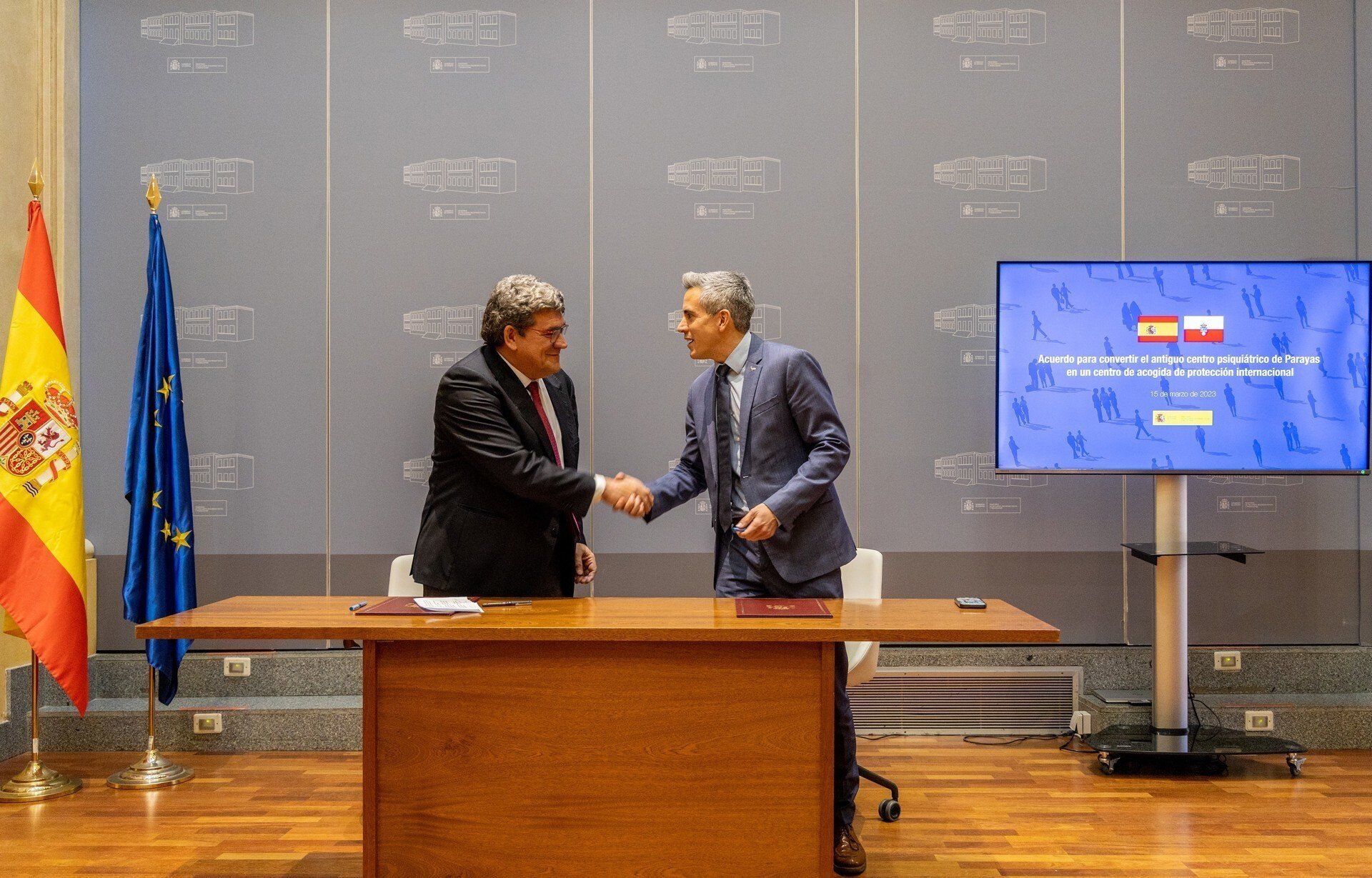 El ministro de Inclusión, Seguridad Social y Migraciones, José Luis Escrivá, y el vicepresidente del Gobierno de Cantabria, Pablo Zuloaga han firmado este miércoles un acuerdo de cesión de uso de los 43.500 metros cuadrados donde se localiza el antiguo Hospital Psiquiátrico de Parayas para convertirlo en un centro de refugiados, con capacidad para 300 personas, cuyas obras de rehabilitación se prevé que se inicien en verano con una inversión del Ejecutivo central de 30 millones de euros.