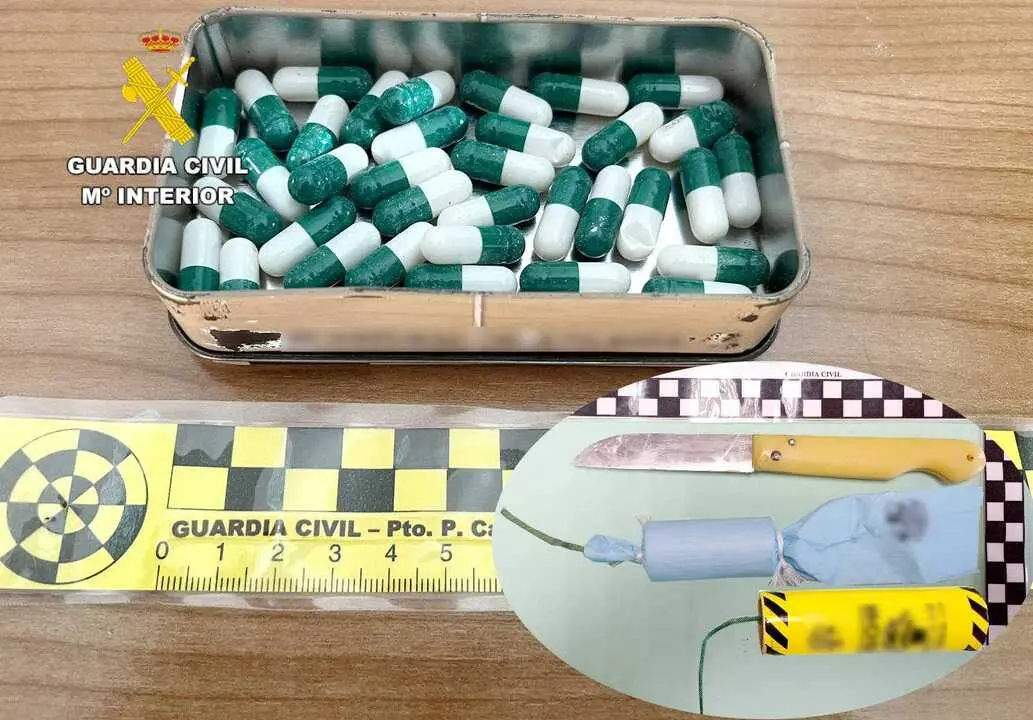 En un bolsillo se localizó una caja con tres cápsulas de éxtasis (MDMA sustancia psicotrópica derivada de la anfetamina), y en el posterior registro del vehículo se hallaron otras 35, por lo que fue detenido y se intervinieron las 38 unidades de éxtasis.