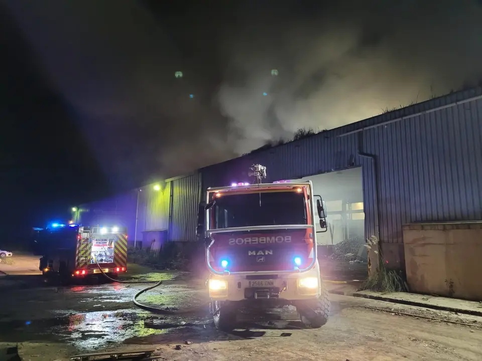 Bomberos de los parques de Camargo, Santander y el 112, con sede en Villacarriedo, trabajan en la extinción de un incendio declarado en una industria de Astillero dedicada al tratamiento de residuos metálicos. Se han visto afectadas toneladas de material de desecho.
