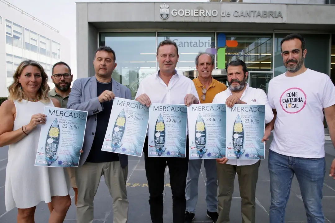 El consejero Guillermo Blanco, ha presentado este lunes el cartel de este 'Mercado de Productores. Escala en Pedreña', junto al alcalde de Medio Cudeyo, Pedro Pérez; la directora general de Pesca y Alimentación, Marta López; y los representantes de la asociación Navigatio, José Ramón Sainz, y de 'Granja en Granja', Jorge Mariscal.