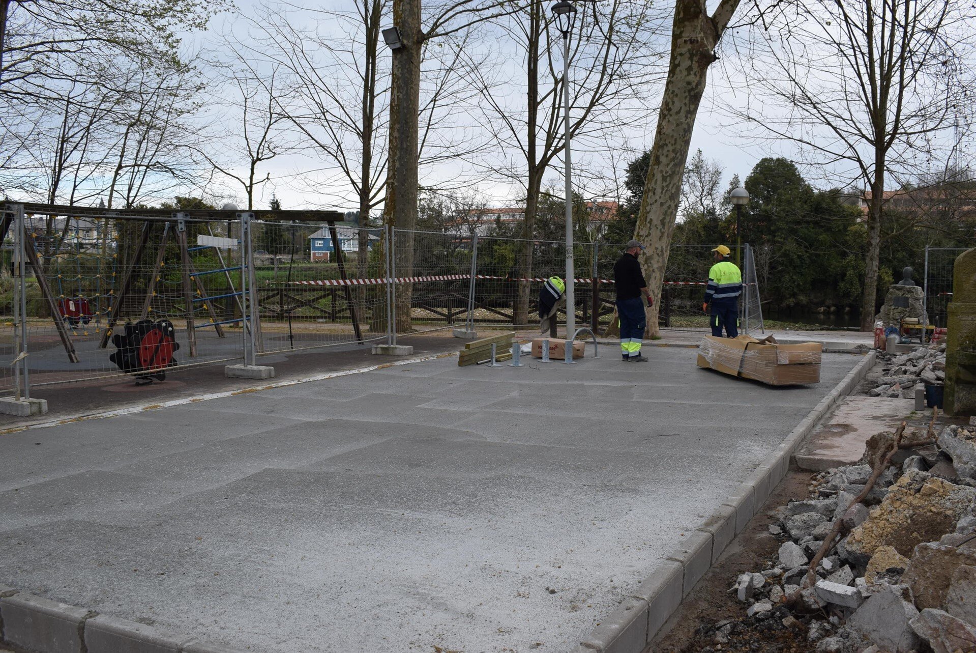 En concreto, las obras que está ejecutando el Ayuntamiento permitirán crear un nuevo recorrido peatonal alrededor del parque, mediante la sustitución de las losas irregulares de piedra por un pavimento continuo de hormigón pulido coloreado en el tramo paralelo al río, y la construcción de una nueva acera entre el muro de las edificaciones existentes y la zona de aparcamiento.