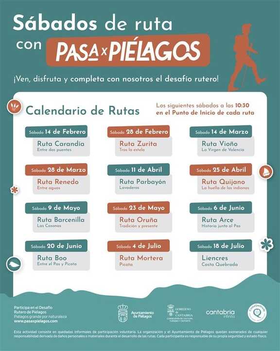 Las otras 11 rutas programadas serán 'Tras la estela', en Zurita (28 de febrero); 'La Virgen de Valencia', en Vioño (14 de marzo); 'Entre aguas', en Renedo (28 de marzo); 'Lavaderos', en Parbayón (11 de abril); 'La huella de los indianos', en Quijano (25 de abril); 'Las Casonas' en Barcenilla (9 de mayo); 'Tradición y presente', en Oruña (23 de mayo); 'Historia junto al Pas', en Arce (6 de junio); 'Entre el Pas y La Picota', en Boo (20 de junio); 'Picota', en Mortera (4 de julio) y 'Costa Quebrada' en Liencres (18 de julio).