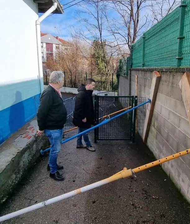 El concejal de Obras y Servicios, Antonio Gómez Mirones, y el de Educación, Luis Sañudo, han visitado las instalaciones existentes en el barrio de Velo, en Arce, donde el Consistorio ha acordonado la zona que se ha visto dañada por las filtraciones de agua.