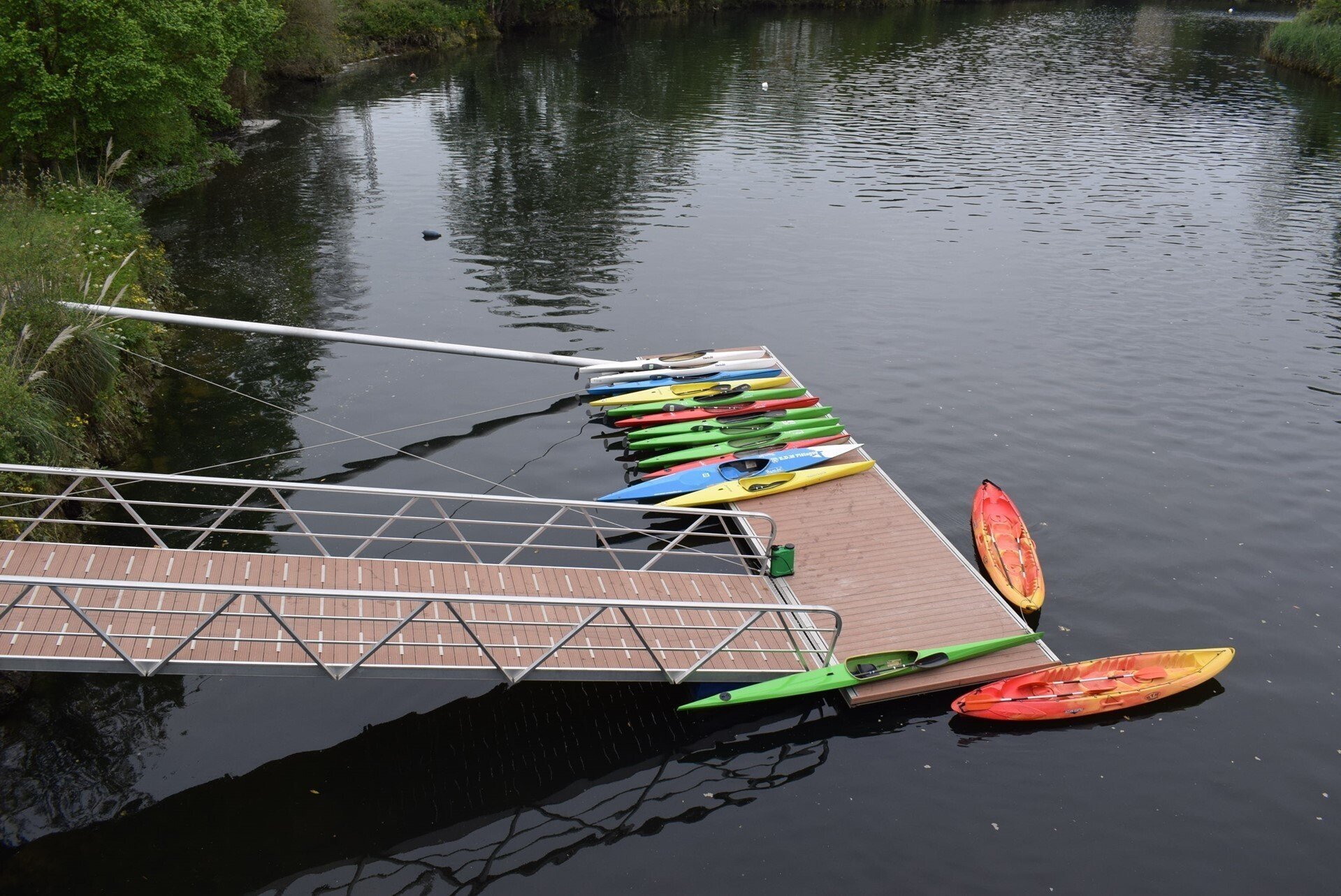 El pantalán tiene 12 metros de longitud, ampliable hasta 18, y tres metros de anchura. Su acceso está formado por una pasarela inclinada pivotante, anclada a la cimentación en el exterior del margen del río, en el lado derecho del pantalán.