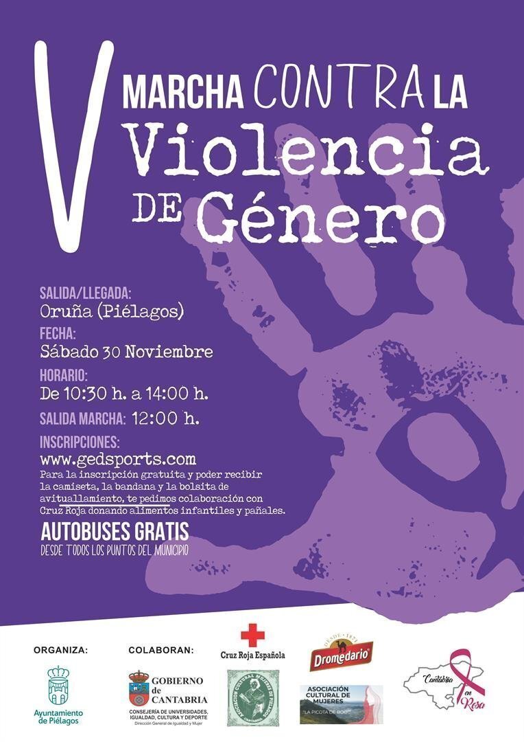 La V Marcha contra la violencia de género de Piélagos cuenta con la colaboración de la Consejería de Universidades, Igualdad, Cultura y Deporte del Gobierno de Cantabria; la Asociación cultural mujeres de Piélagos; la Asociación cultural de mujeres La Picota de Boo; la Asociación 'Cantabria en rosa'; Cruz Roja Española y Café Dromedario.
