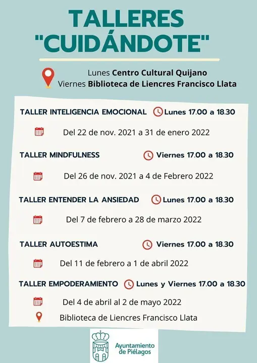 Y la Biblioteca Municipal Francisco Llata de Liencres será la sede de los talleres 'Mindfulness' (del 26 de noviembre de 2021 a 4 de febrero de 2022), 'Autoestima' (del 11 de febrero a 1 de abril de 2022) y 'Empoderamiento' (del 4 de abril a 2 de mayo de 2022).