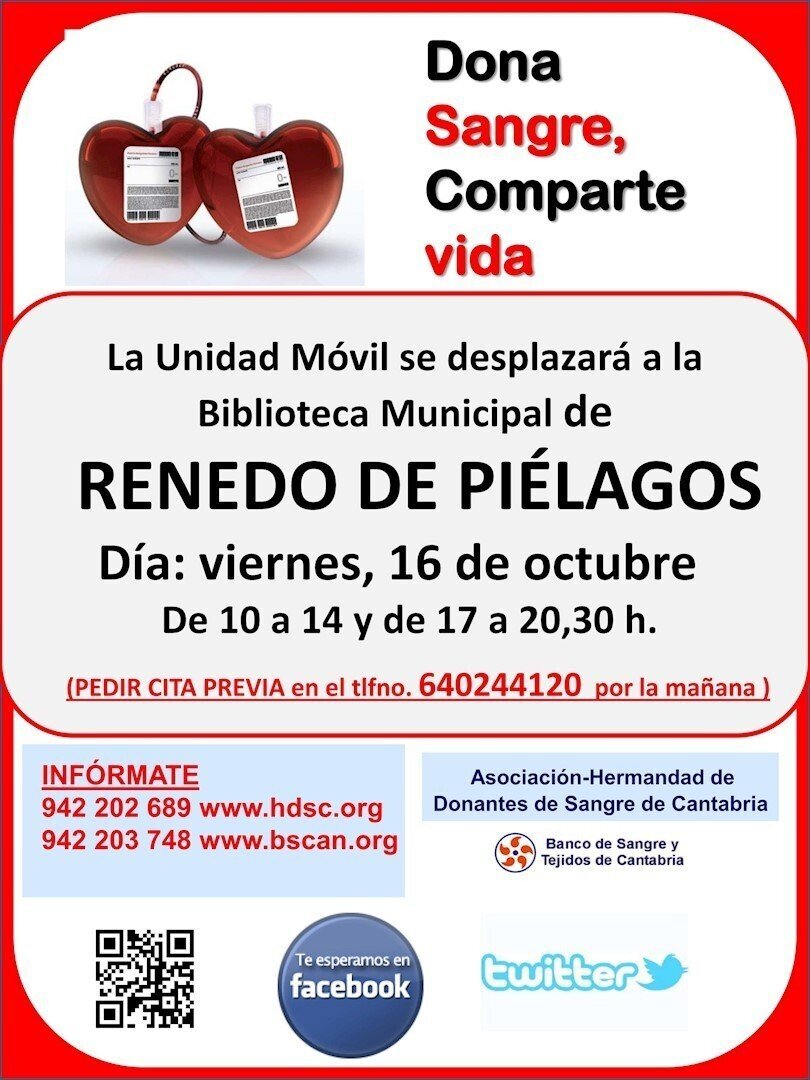 La localidad de Renedo, en el municipio de Piélagos, acogerá este viernes, 16 de octubre, una jornada de donación de sangre, para la que se precisará cita previa.