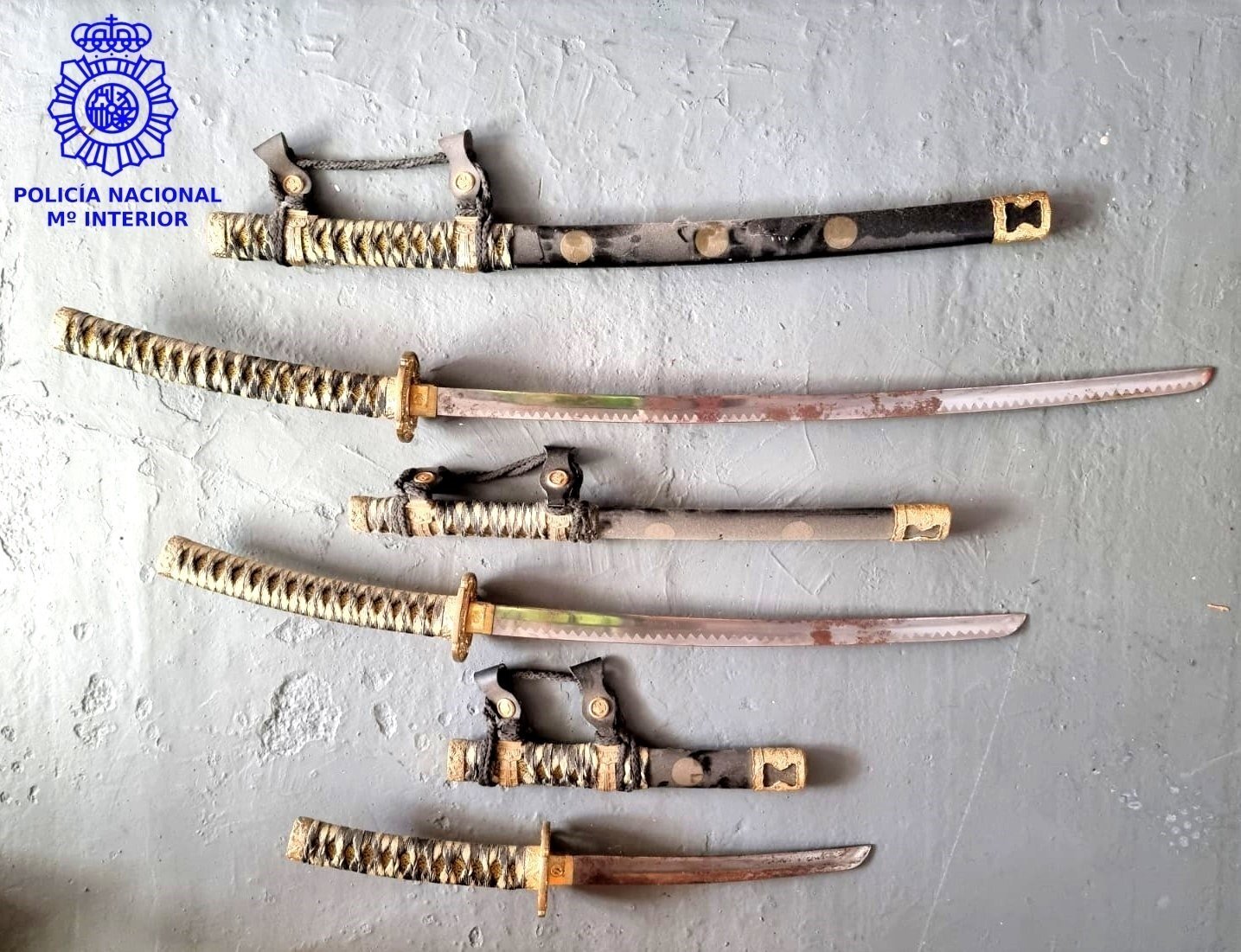 En el registro de la vivienda se incautaron varias plantas de marihuana en el último estadio de floración, un semillero para plantas, abundantes cogollos de marihuana, un bastón extensible y tres catanas de distinto tamaño.