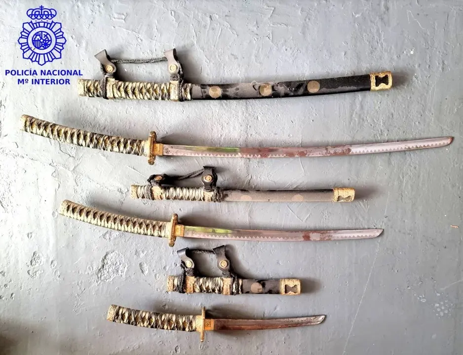 En el registro de la vivienda se incautaron varias plantas de marihuana en el último estadio de floración, un semillero para plantas, abundantes cogollos de marihuana, un bastón extensible y tres catanas de distinto tamaño.