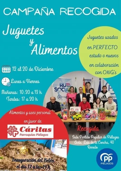 El Partido Popular de Piélagos iniciará este lunes 12 la tradicional recogida de juguetes y alimentos organizada por el partido con motivo de la Navidad, que este año alcanza la decimoctava edición.