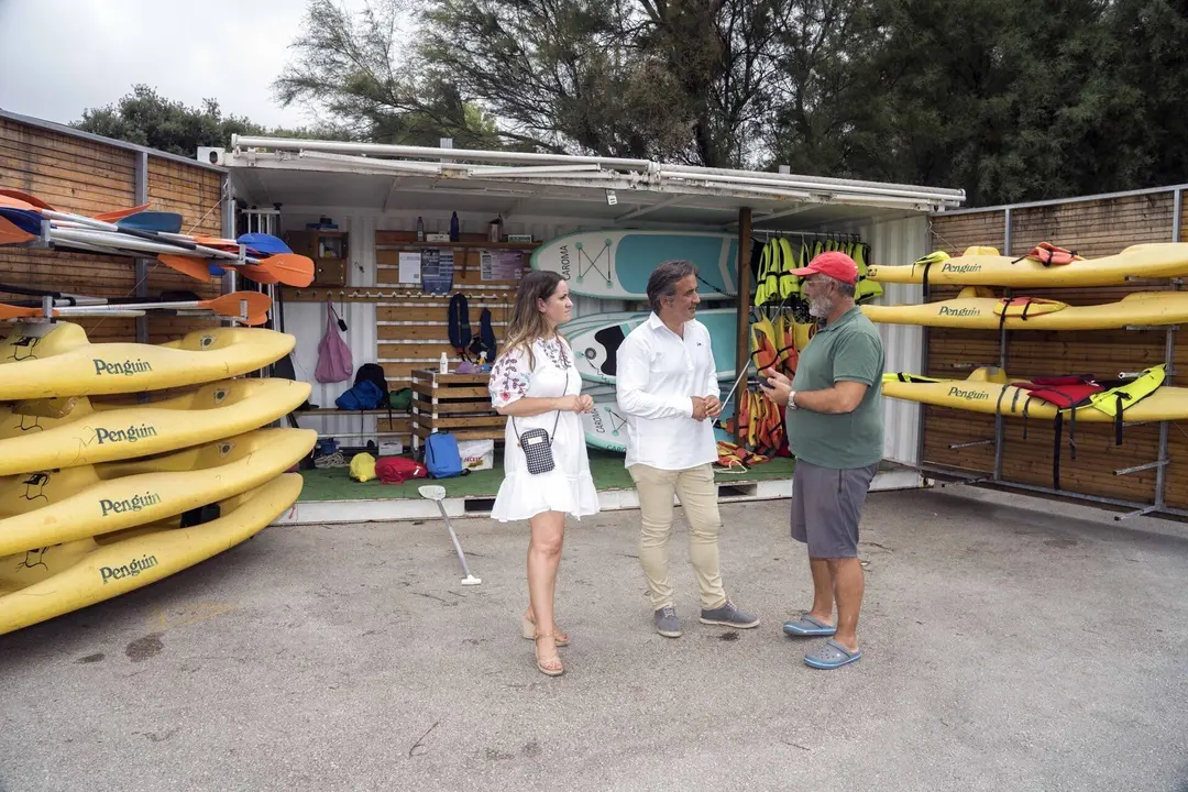El alcalde de Camargo, Diego Movellán, ha visitado este punto de alquiler de canoas y tablas para comprobar el servicio que oferta el Ayuntamiento, acompañado por la concejala de Deportes y el coordinador de este área, María Higuera y José Ángel Diestro, respectivamente.