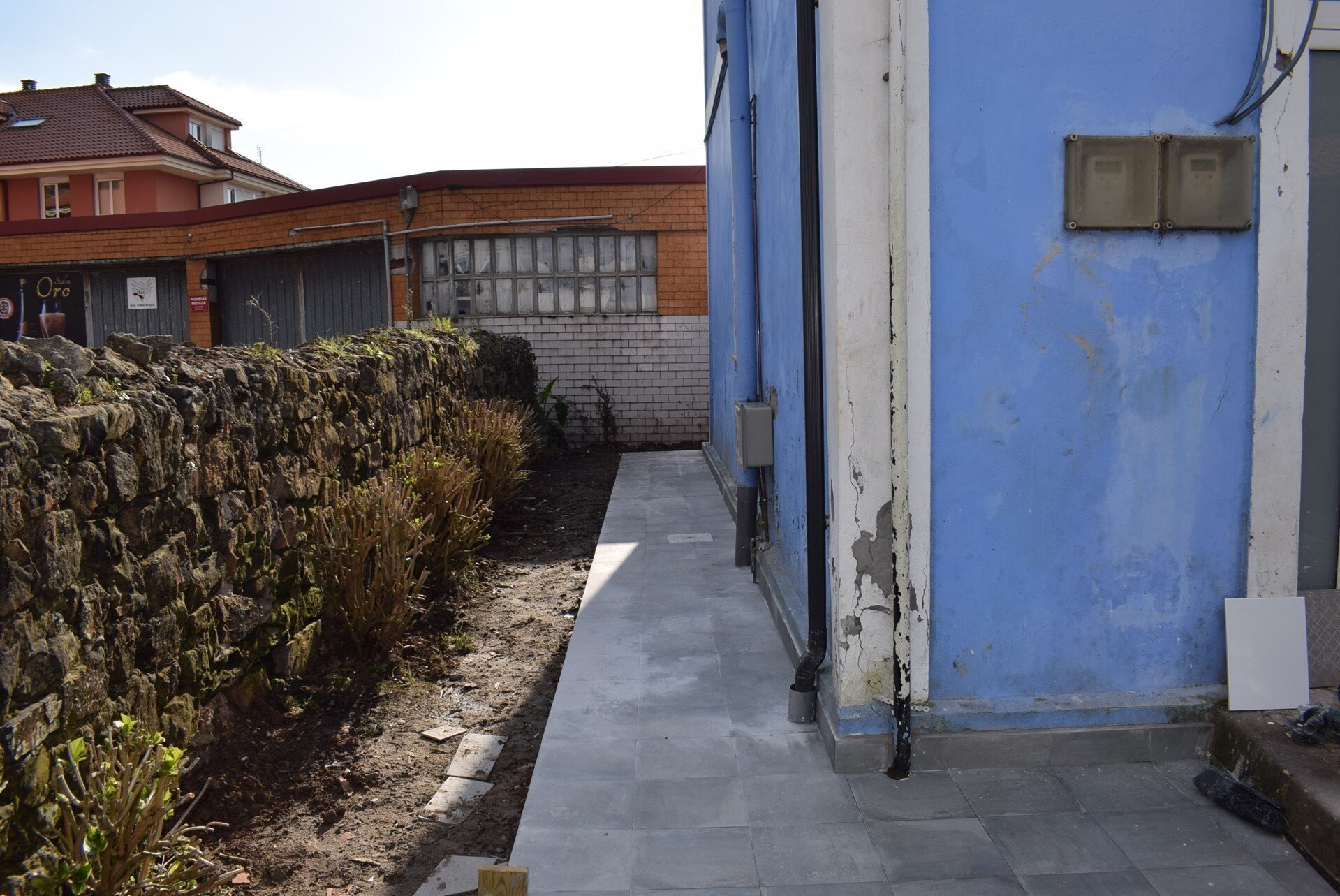 En el exterior del inmueble se ha instalado una acera perimetral para evitar las humedades, al tiempo que se colocará un zócalo de aplacado de gres para aislar la parte inferior de la fachada, que será pintada en su totalidad.