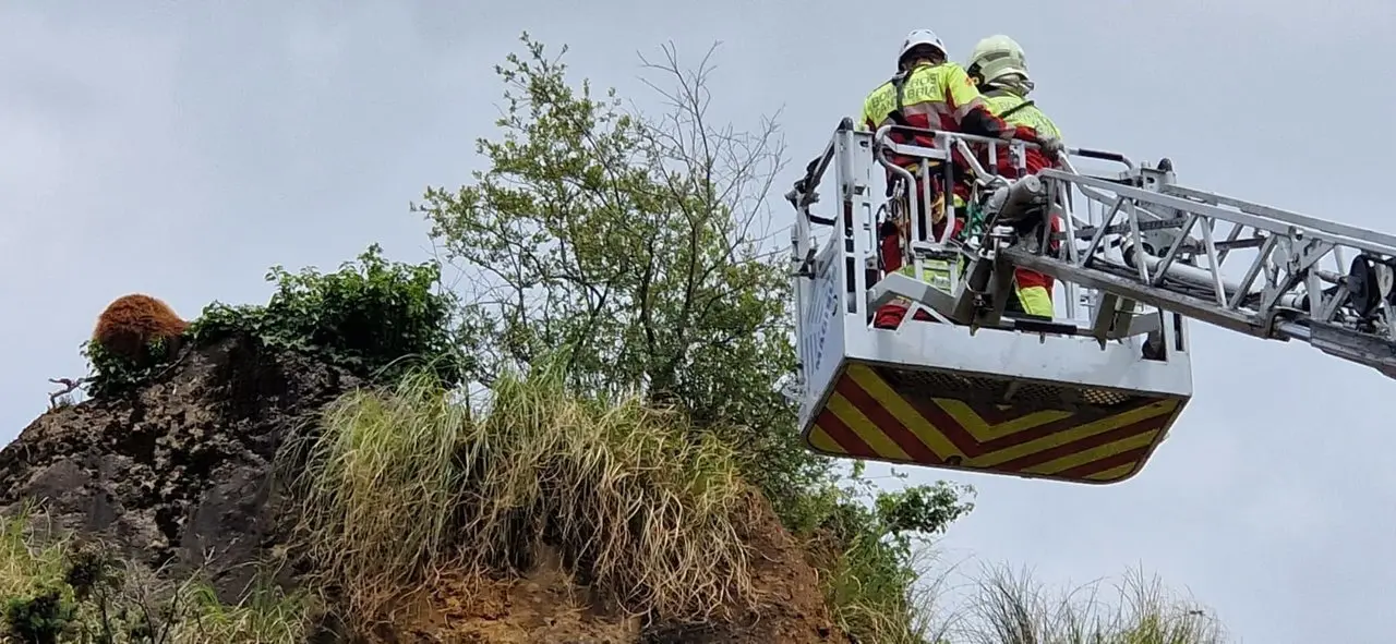 Posteriormente, con el ejemplar dormido en el borde de la peña, dos dotaciones de bomberos del 112, en una operación compleja, le han bajado a zona segura valiéndose de una autoescala y del montaje de un sistema de rescate vertical.