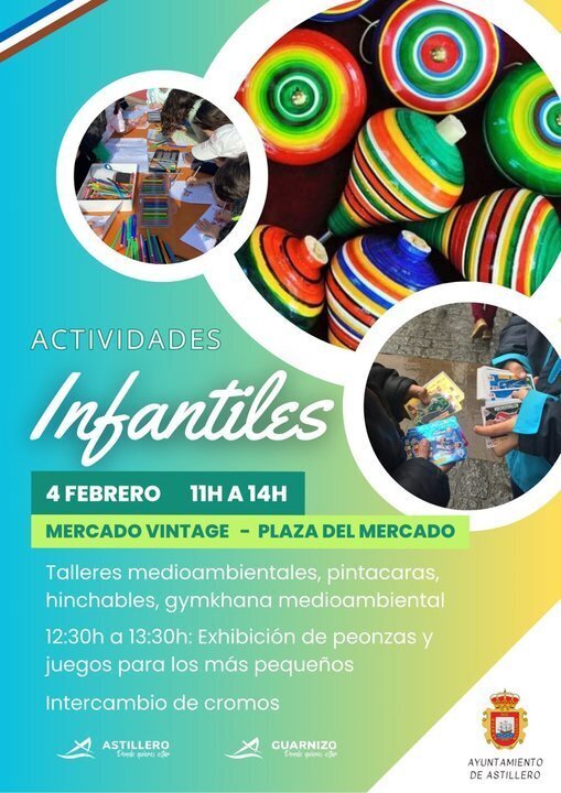 La Semana del Medioambiente de Astillero ofrecerá este domingo, 4 de febrero, diversas actividades infantiles en el entorno de la Plaza del Mercado. Aprovechando la celebración del Mercado Vintage mensual, habrá talleres, hinchables, exhibiciones de peonzas o intercambio de cromos, entre otras propuestas.