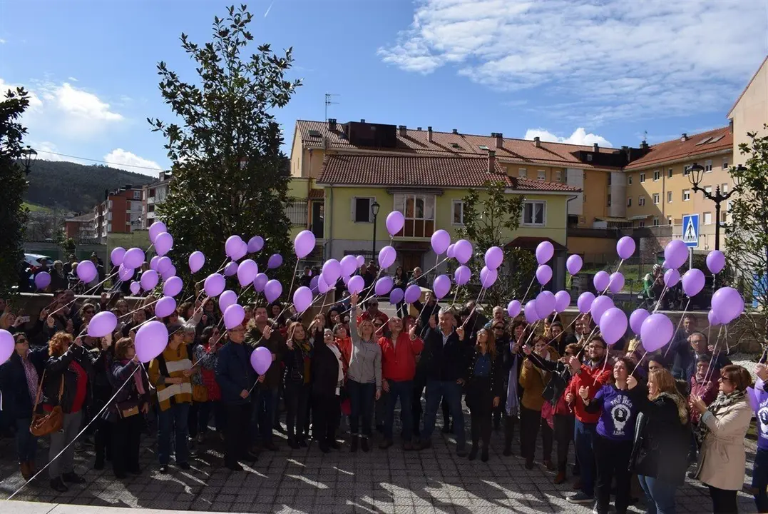 Como símbolo de este mensaje, vecinos y vecinas del municipio han soltado en el exterior del Consistorio un centenar de globos morados, acompañados por la voz de Rosalía y su canción 'A ningún hombre'.