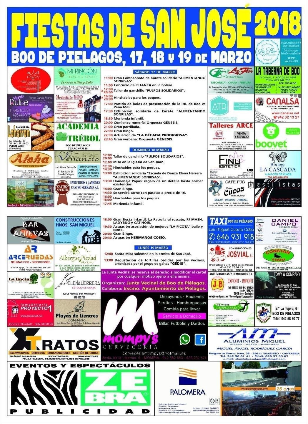 La localidad de Boo celebrará del 17 al 19 de marzo las Fiestas de San José 2018, organizadas por la Junta Vecinal en colaboración con el Ayuntamiento de Piélagos, cuyo programa festivo incluye varias actuaciones musicales, así como talleres y exhibiciones.