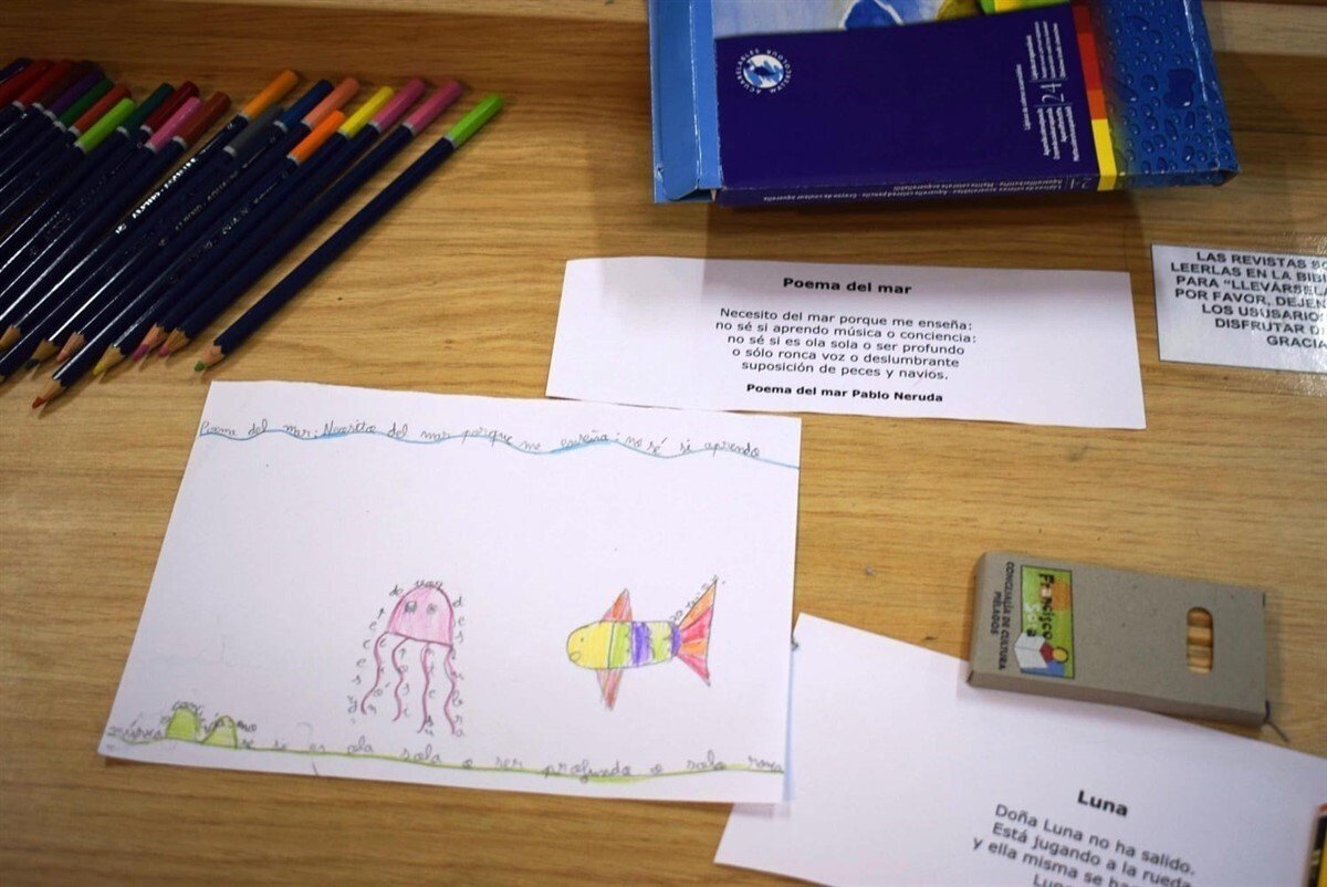 Los niños de Piélagos han celebrado el Día internacional del Libro leyendo poemas que, después, han convertido en dibujos en un taller de caligramas que se ha desarrollado simultáneamente en las Bibliotecas municipales Francisco Sota (Renedo), Condes de la Mortera (Mortera) y Francisco Llata (Liencres).