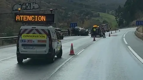Uno de los vehículos implicados se encuentra en el carril izquierdo de la vía, por lo que este esta cortado, y el otro, caído en el terraplén entre la autovía y enlace de incorporación desde Boo.