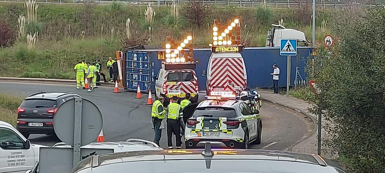 Vuelca un camión en la salida 9 de la S30 entre Liaño y Guarnizo