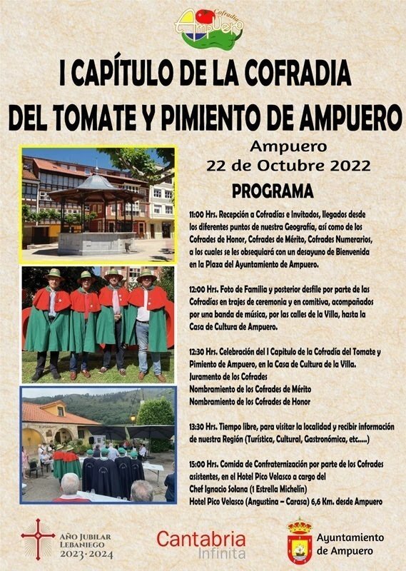 La Cofradía del Tomate y Pimiento de Ampuero celebrará el 22 de octubre su Primer Capítulo donde tomarán juramento como cofrades todos sus miembros y el periodista Jon Uriarte, el chef con estrella michelín Ignacio Solana y el jugador y capitán del Racing de Santander, Íñigo Sainz-Maza, nacido en el municipio, serán nombrados cofrades de honor.