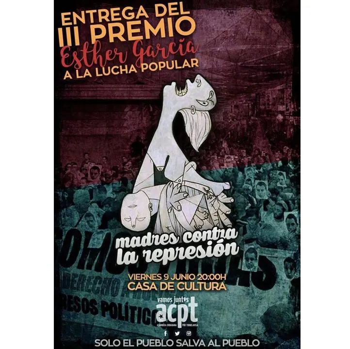 ACPT ha presentado este viernes esta tercera edición de este premio, creado en memoria de Esther García y que se concede a quienes hayan destacado "por su constancia y persistencia en el impulso y la lucha vecinal, ecologista, anticapitalista, obrera, feminista o política, en sintonía con los principios que encarnó y defendió Esther García". A las galardonadas de 'Madres contra la Represión' se les hará entrega de una talla de madera original, creada al efecto por el artesano Óscar Jubete. ACPT ha decidido premiar a este colectivo "por su admirable lucha contra la represión que éste sistema ejerce ante toda forma de lucha que pueda hacer tambalear sus cimientos de injusticia y abuso" y "porque no sólo luchan por la libertad de sus hijos y allegados, si no que han asumido la responsabilidad de luchar contra todo caso de represión como herramienta sistémica que utiliza el Estado". Y es que, según destacado ACPT, este colectivo "siempre que puede está acompañando a las personas detenidas e imputadas y sus familias en las comisarías y juzgados, tanto en detenciones como en juicios" y además "proporciona un abogado que está para la primera atención a la persona detenida en caso necesario e incluso ayuda psicológica de confianza cuando así se las requiere".