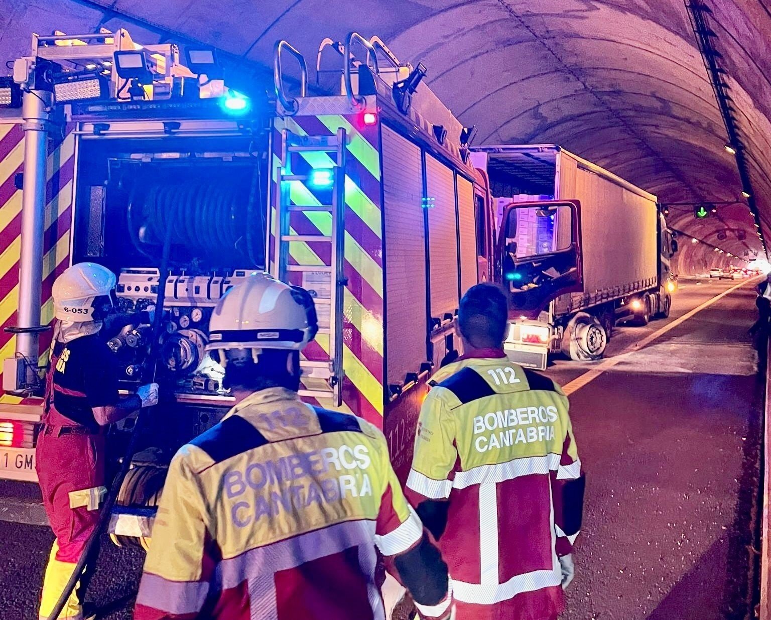 Bomberos del Gobierno de Cantabria han refrescado en las últimas horas un pequeño incendio de un camión en el Túnel de Pedredo, en Arenas de Iguña, tras la avería de una rueda en la A-67.