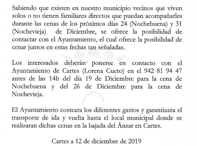 El Ayuntamiento de Cartes organiza cenas en Nochebuena y Nochevieja para que ningún vecino esté solo