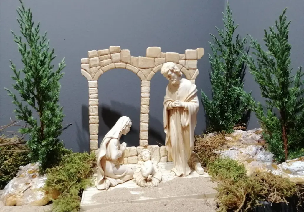 La exposición presenta 60 belenes de diversos tamaños, algunos compuestos por nacimientos completos y otros por el misterio, realizados en materiales como cristal, bronce, cerámica o porcelana. Un conjunto en el que destacan cuatro representaciones de suma importancia en madera policromada y marfil.