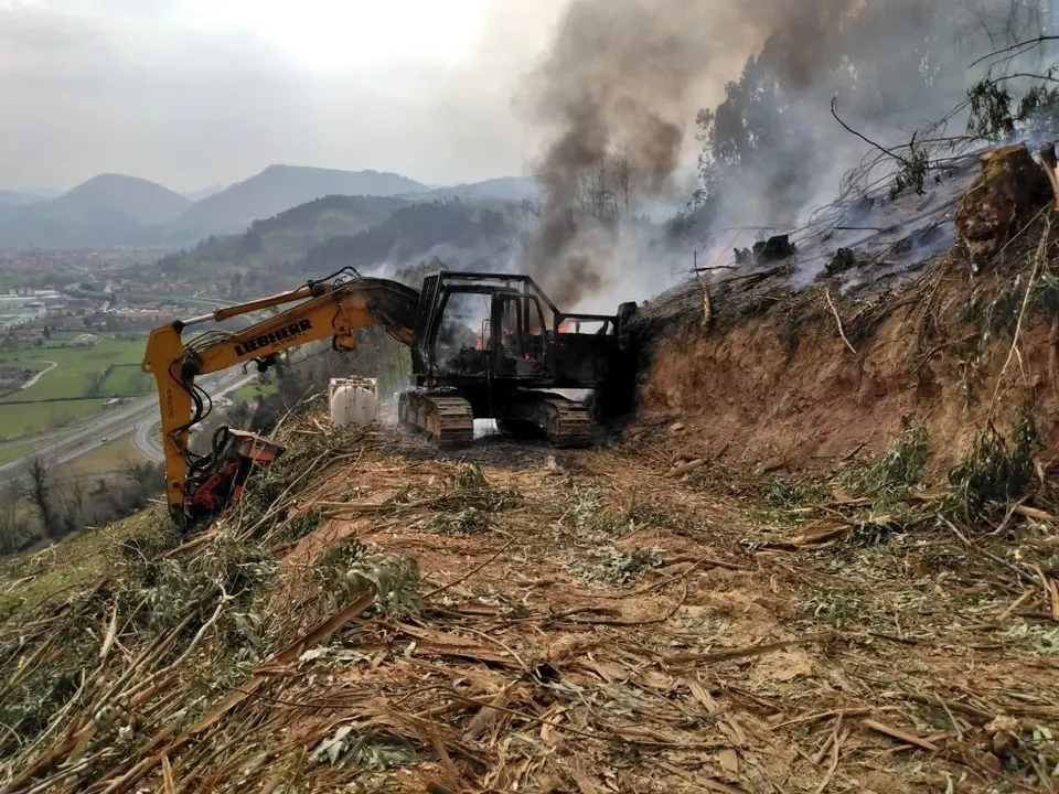 Bomberos del 112 Cantabria han extinguido esta tarde un incendio de maquinaria pesada en un área de montes ubicada en la localidad de Barros (Los Corrales de Buelna).