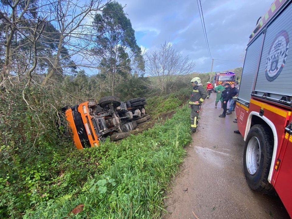 Un conductor ha resultado herido leve tras el vuelco de su camión en un camino municipal que da acceso a Ruiseñada (Comillas), en un accidente en el que ha tenido que ser excarcelado de la cabina.