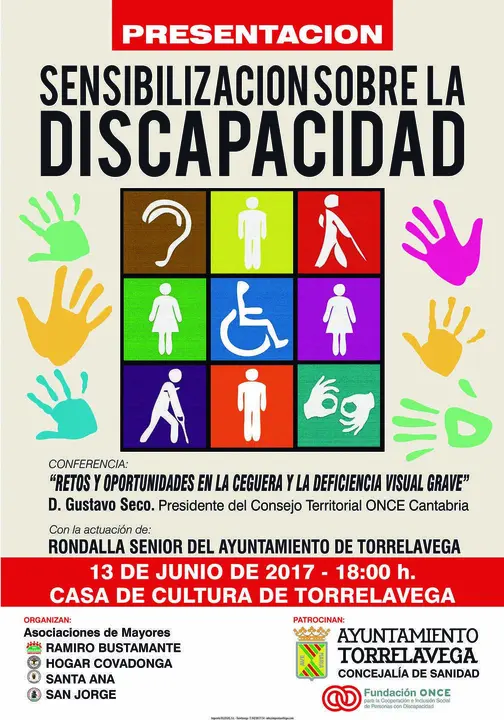 Las Asociaciones de Mayores de Torrelavega (Ramiro Bustamante, Hogar Covadonga, Santa Ana y San Jorge), con la colaboración de la concejalía de Sanidad que dirige Verena Fernández, ha organizado una conferencia sobre ‘Retos y oportunidades en la ceguera y la deficiencia visual grave’ a cargo del presidente del Consejo Territorial de la ONCE en Cantabria, Gustavo Seco. La charla, ha explicado Verena Fernández, tendrá lugar el martes, 13 de junio, a las 18 horas, en la Casa de Cultura de Torrelavega, y servirá de presentación de los Talleres de ‘Sensibilización sobre la discapacidad’ que monitores de la Fundación ONCE impartirán los meses de octubre y noviembre en los Centros de Mayores, y otros centros asistenciales de la zona. El objetivo, ha subrayado la responsable de Sanidad, es “dar a conocer como podemos ayudar a las personas con discapacidad”. Fernández ha animado a todos los vecinos del municipio ha acudir a esta jornada en la que también actuará la Rondalla Senior del Ayuntamiento de Torrelavega. La entrada es libre y gratuita.