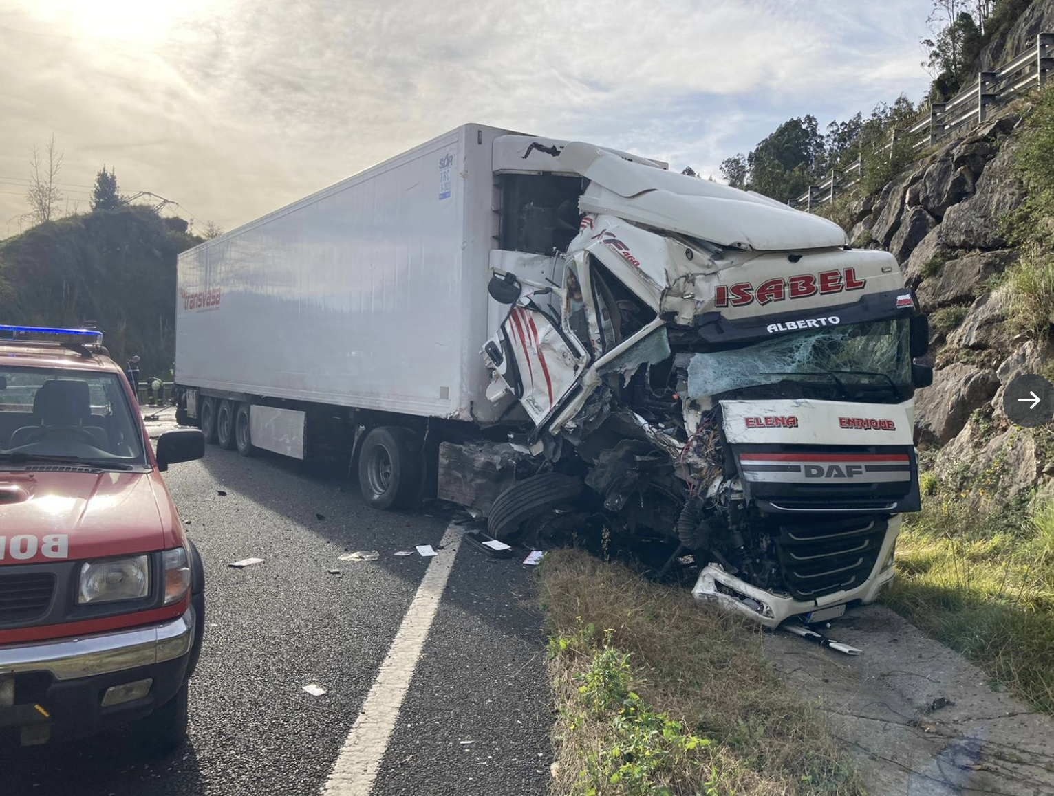 Una colisión entre dos camiones mantiene cortada la autovía A67 sentido Torrelavega a su paso por Las Caldas de Besaya.