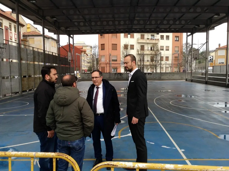 La cubierta de la pérgola, el suelo de la pista de baloncesto, y el asfaltado del vial de acceso al Cementerio de Geloria y Miravalles