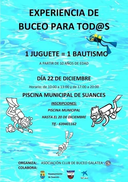 Se trata de una sesión de iniciación al buceo en el que pueden participar todas las personas mayores de 10 años de edad que lo deseen. A cambio entregarán un juguete en buen estado. El objetivo es contribuir a que ningún niño se quede sin recibir un regalo estas navidades.