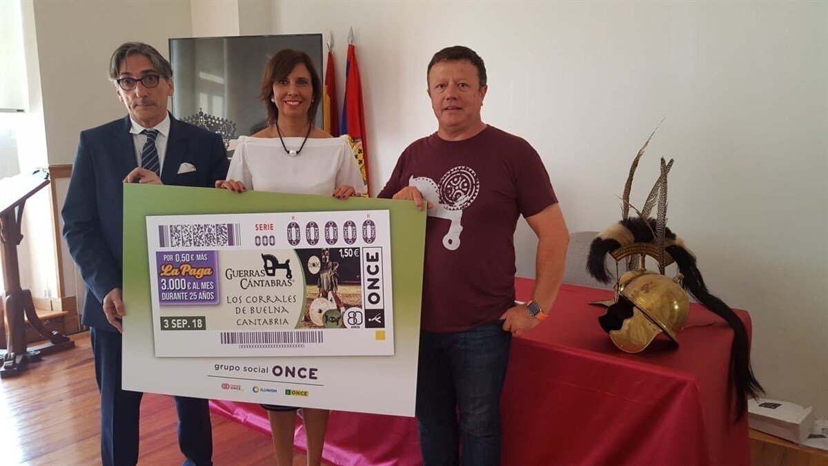 El cupón ha sido presentado por Pedro Gregorio Caballero, director técnico adjunto de la ONCE, y Josefa González Fernández, alcaldesa de Los Corrales, acompañados por Óscar del Val, presidente de la Asociación Guerras Cántabras, declaradas de Interés Turístico Nacional en 2008.