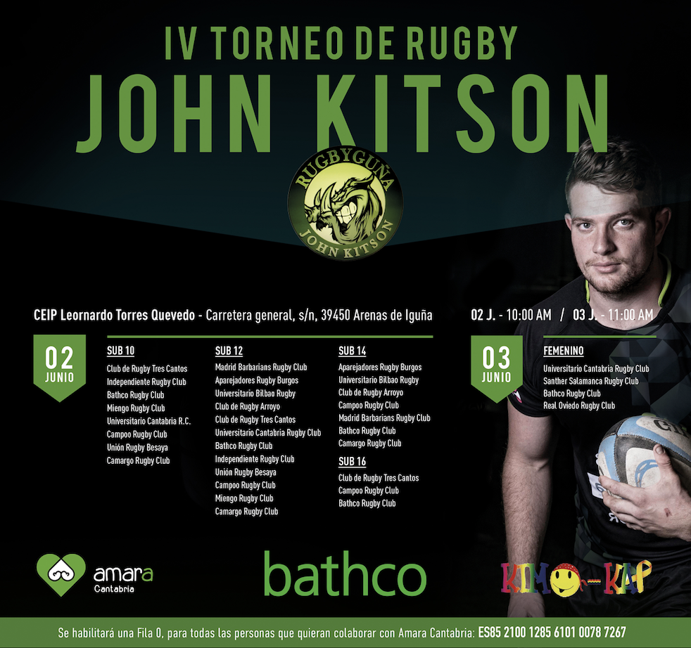 Los días 2 y 3 de junio de 2018 se celebrará el IV Torneo John Kitson organizado por RugbYguña Club y que tendrá lugar en el CEIP Leonardo Torres Quevedo de Arenas de Iguña. Como en ediciones anteriores el evento pretende que tanto participantes como público en general disfrute de un fin de semana en familia y que sean conocedores de los valores que promueve el rugby.