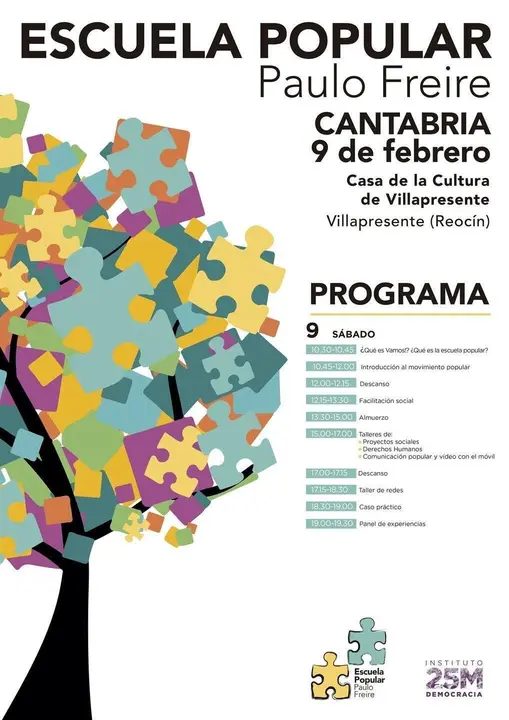 La Casa de la Cultura de Villapresente (Reocín) acoge este sábado, 9 de febrero, una jornada organizada por la Escuela Popular Paulo Freire con la colaboración del Instituto 25 de mayo, fundación vinculada a Podemos.