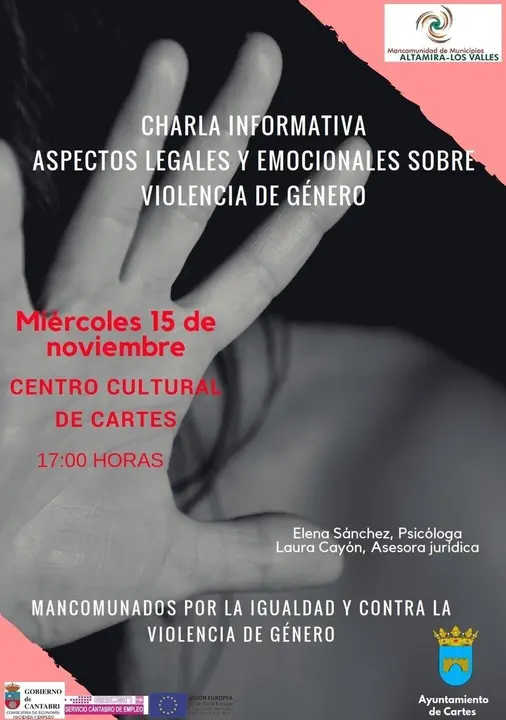 La Mancomunidad Altamira-Los Valles, integrada por los municipios de Cartes, Santillana del Mar y Reocín, ha organizado para este miércoles, 15 de noviembre, a las 17.00 horas, en el centro cultural de Cartes, una charla dentro de la campaña 'Mancomunados por la Igualdad y Contra la Violencia de Género'.