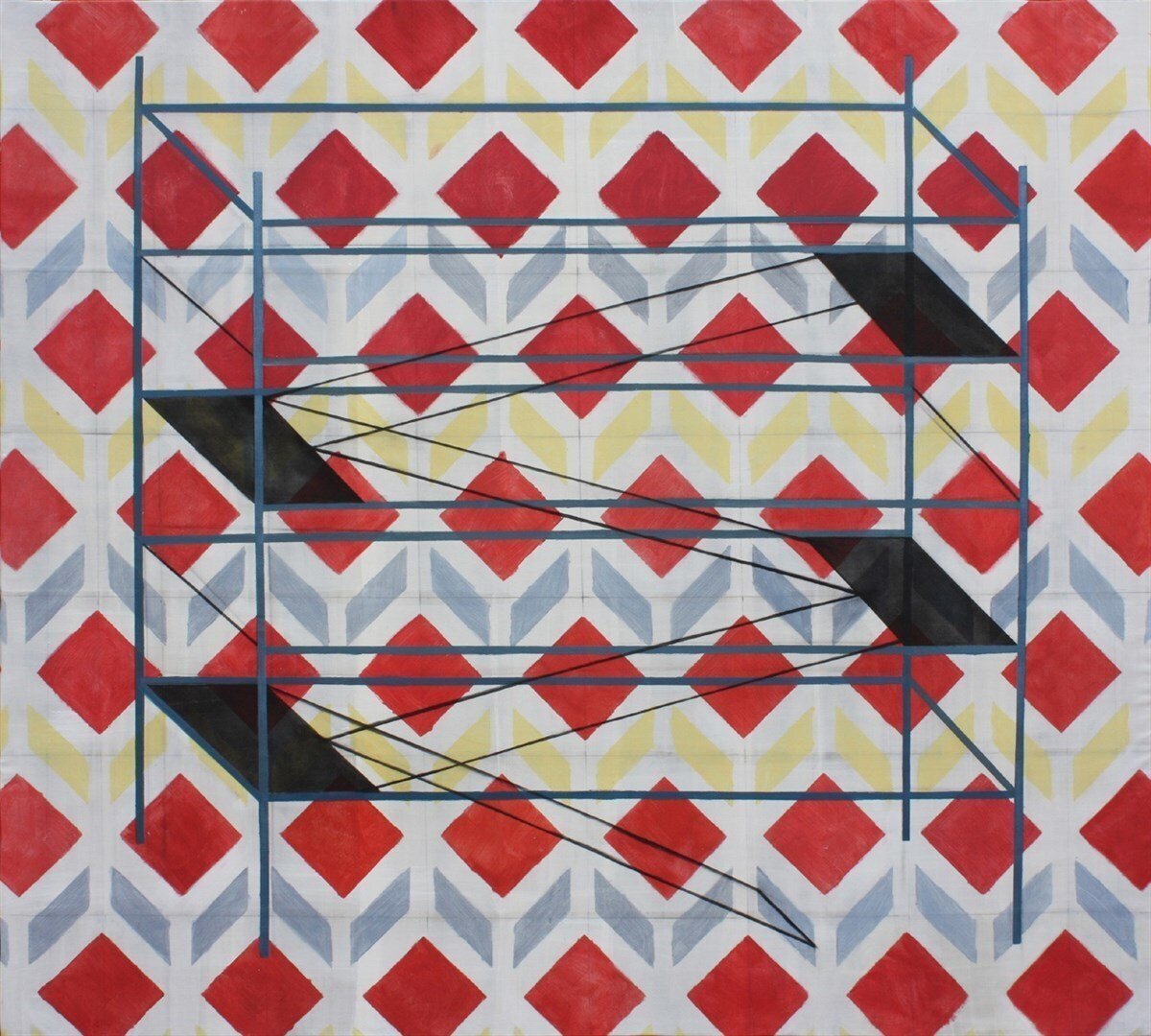 Cada composición está protagonizada por una estructura trazada dibujada al carbón que organiza el espacio y sugiere la forma de un andamio, una escalera o una torre, sobre un paisaje con el que establece un diálogo creando su propia realidad.