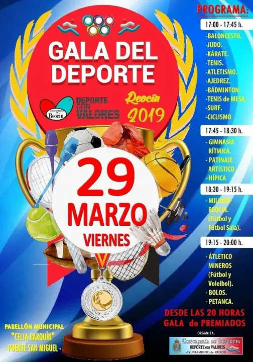 La gran fiesta del deporte de Reocín, en la que se distinguen a los mejores deportistas del año 2018, se celebrará este viernes, 29 de marzo, en el pabellón municipal Celia Barquín de Puente San Miguel. Además se hará un reconocimiento especial a las Anjanas Solidarias y a la propia Celia Barquín.