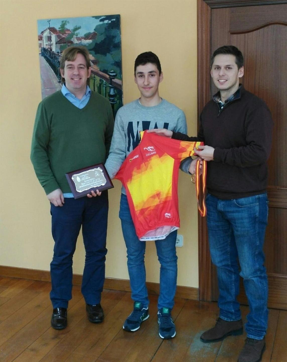 El joven ha sido recibido por el alcalde de Reocín, Pablo Diestro, y el teniente de alcalde y concejal de Deportes, Mario Iglesias, en el Ayuntamiento, donde recibió una placa por sus méritos deportivos en ciclismo.