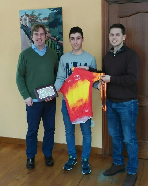 El joven ha sido recibido por el alcalde de Reocín, Pablo Diestro, y el teniente de alcalde y concejal de Deportes, Mario Iglesias, en el Ayuntamiento, donde recibió una placa por sus méritos deportivos en ciclismo.