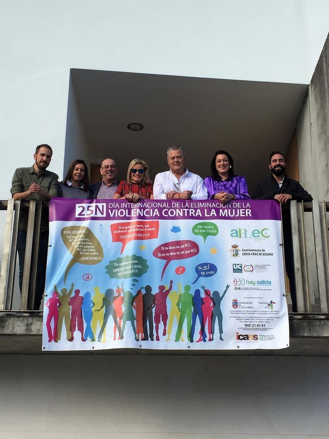 El alcalde de Santa Cruz de Bezana y portavoz socialista, Joaquín Gómez, la concejala de Igualdad, Nuria Cardenal, y los ediles Luis del Piñal (IU-Ganemos), Milagros Bárcena (ADVI), Marta Fernández (PP), Manuel Pérez (PRC) e Ignacio Fernández, portavoz de Ciudadanos, han asistido hoy de manera conjunta a la presentación de la campaña informativa de APLEC para conmemorar el Día Internacional de la Eliminación de la Violencia contra la Mujer que tendrá lugar el 25 de noviembre.