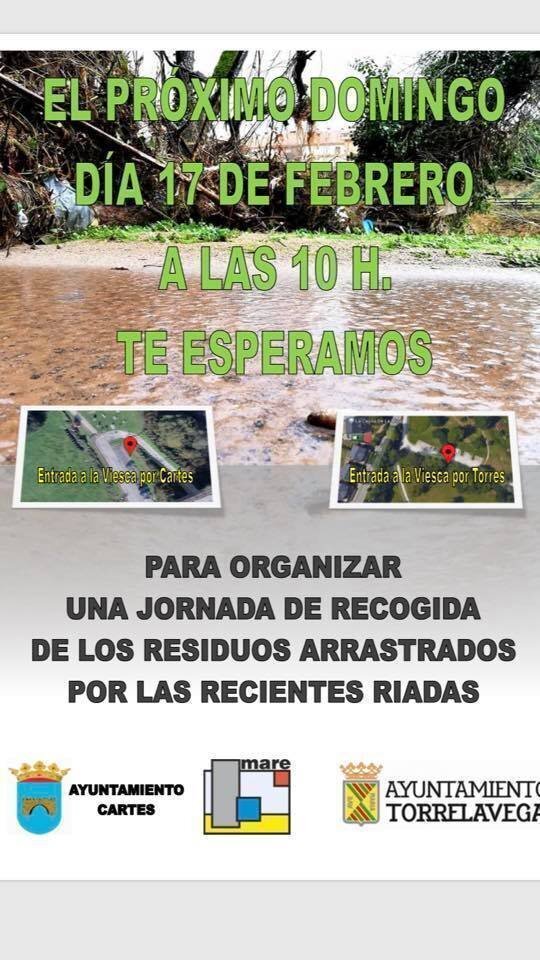 Los alcaldes de Cartes y Torrelavega han hecho un llamamiento a todas las personas que deseen colaborar en la limpieza de los residuos arrastrados por las riadas para que ayuden este domingo a "recuperar el estado natural de La Viesca", retirando plásticos y maderas depositados en el margen del río. "Juntos podemos ser partícipes de una gran labor", han dicho.